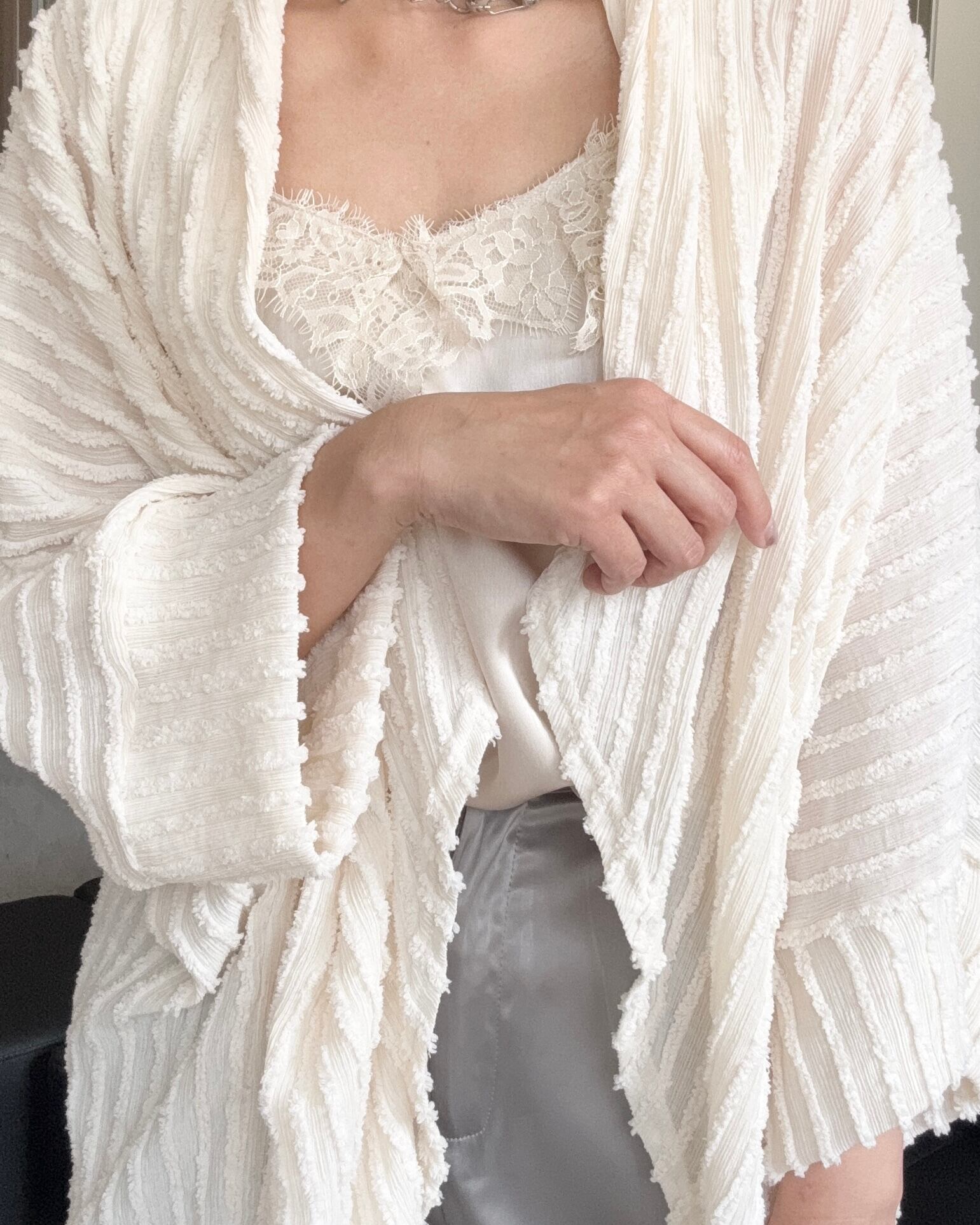 前開きでさっと羽織れる仕様で、上品なドレープが生まれる柔らかなラインが特徴です。